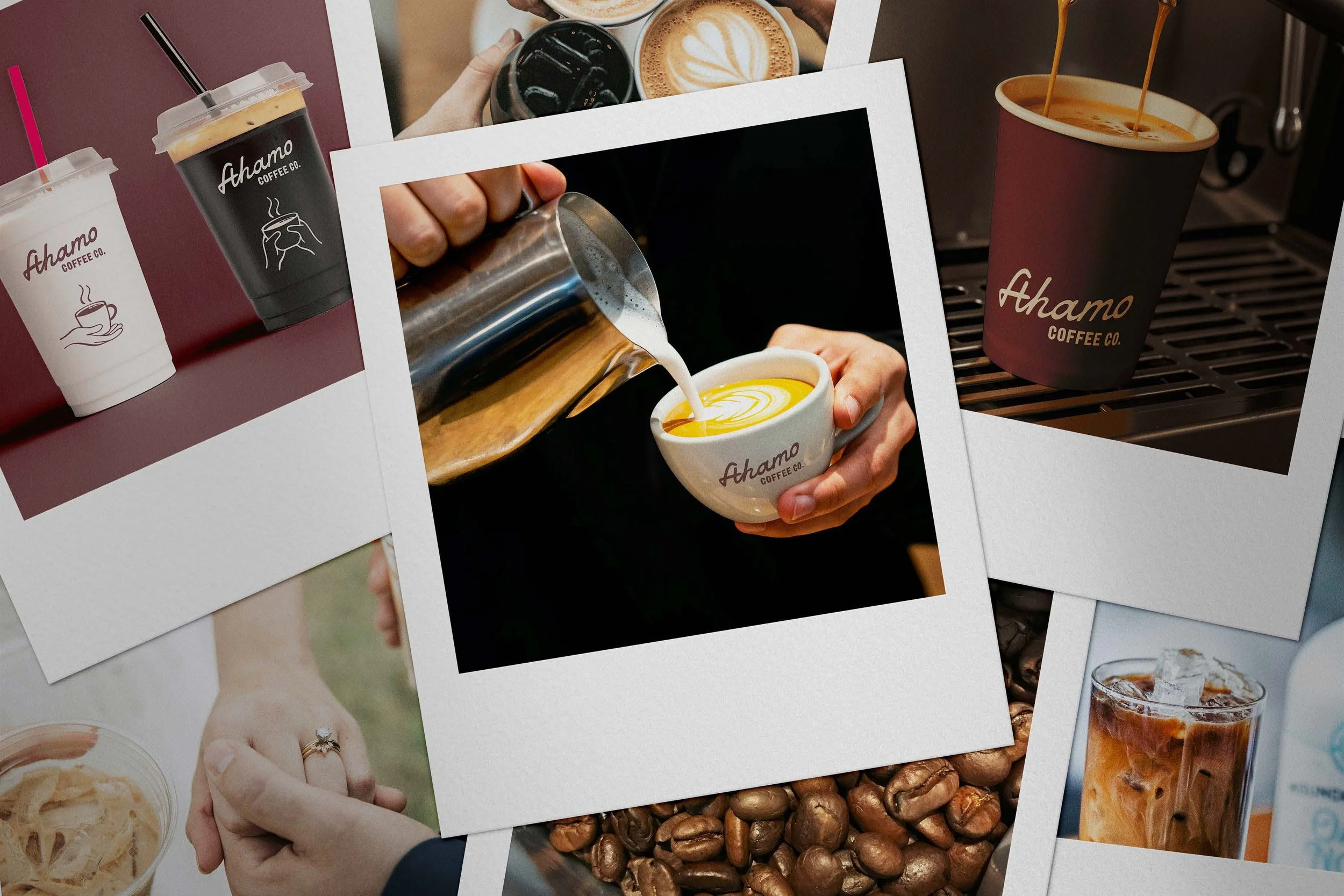 A person holding a maroon baseball cap with embroidered white text that reads 'Ahamo Coffee Co.', a coffee catering service in Omaha, NE.
